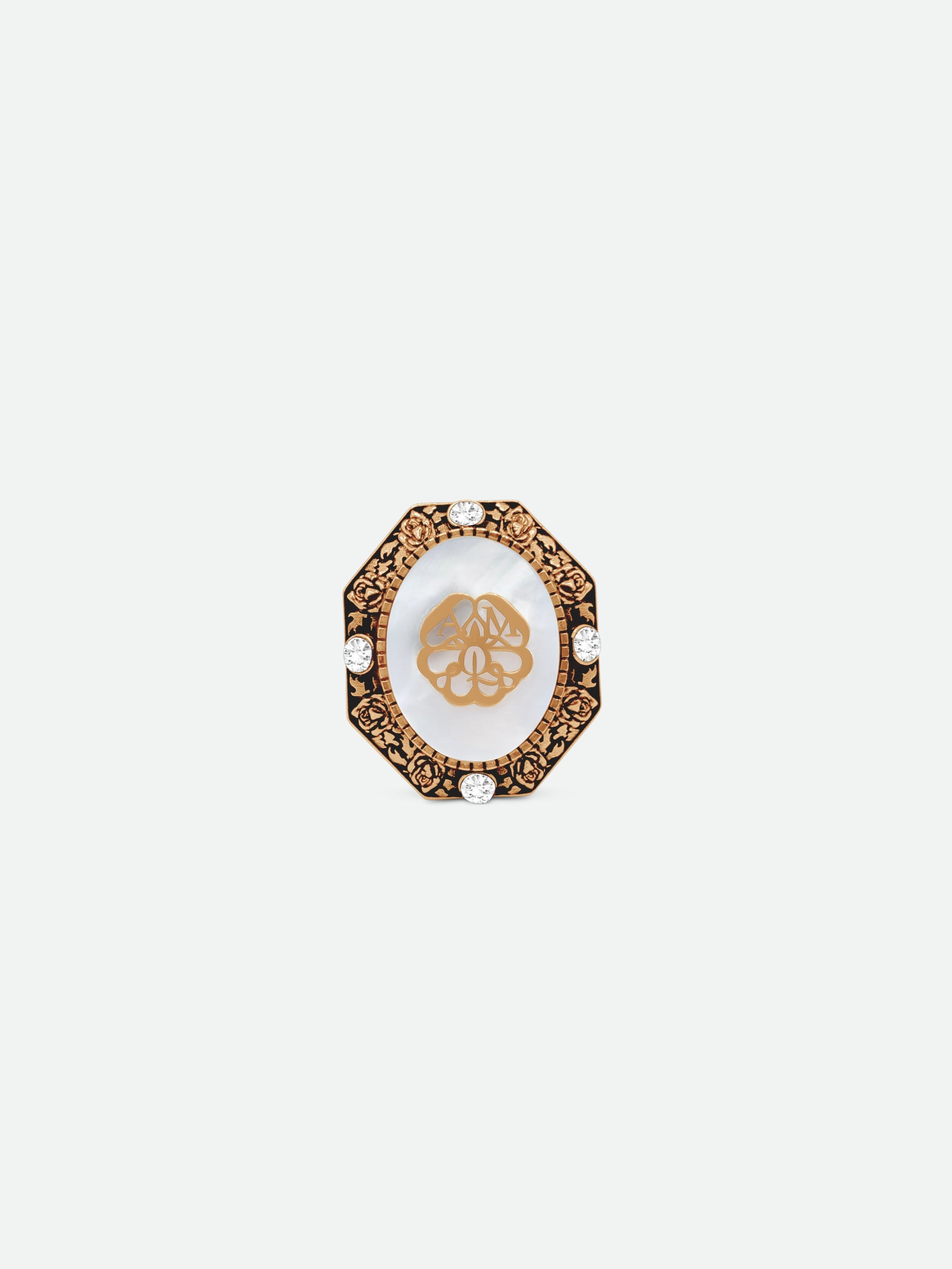A statement Alexander McQueen ring, featuring an aged gold-tone finish, a faux pearl centrepiece, and crystal accents, complemented by the iconic McQueen logo.