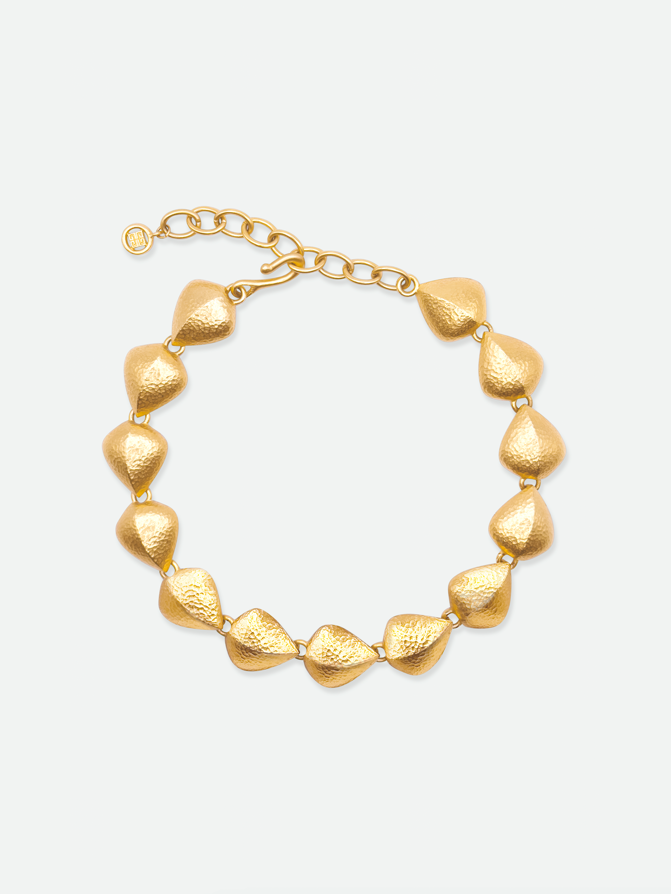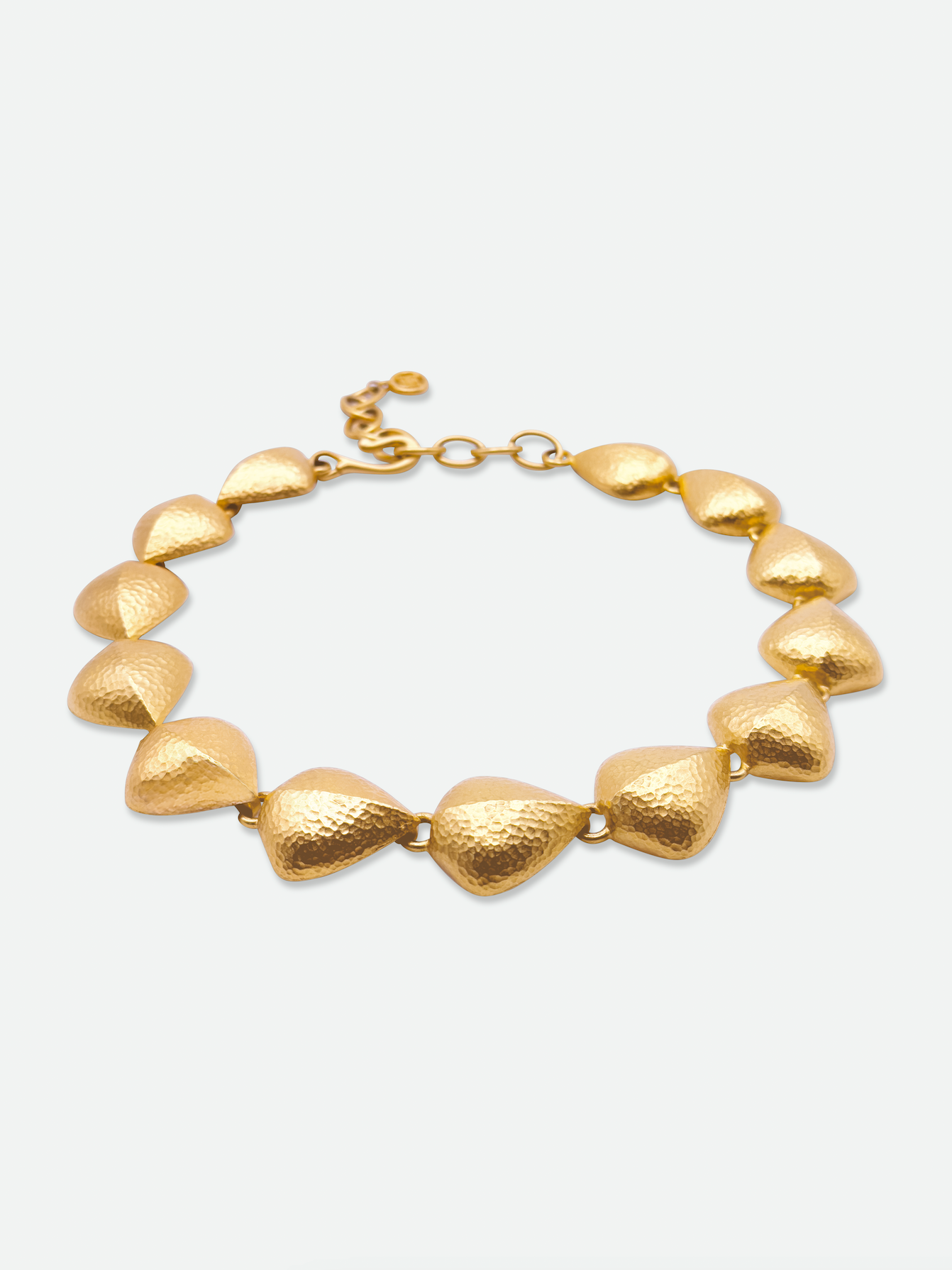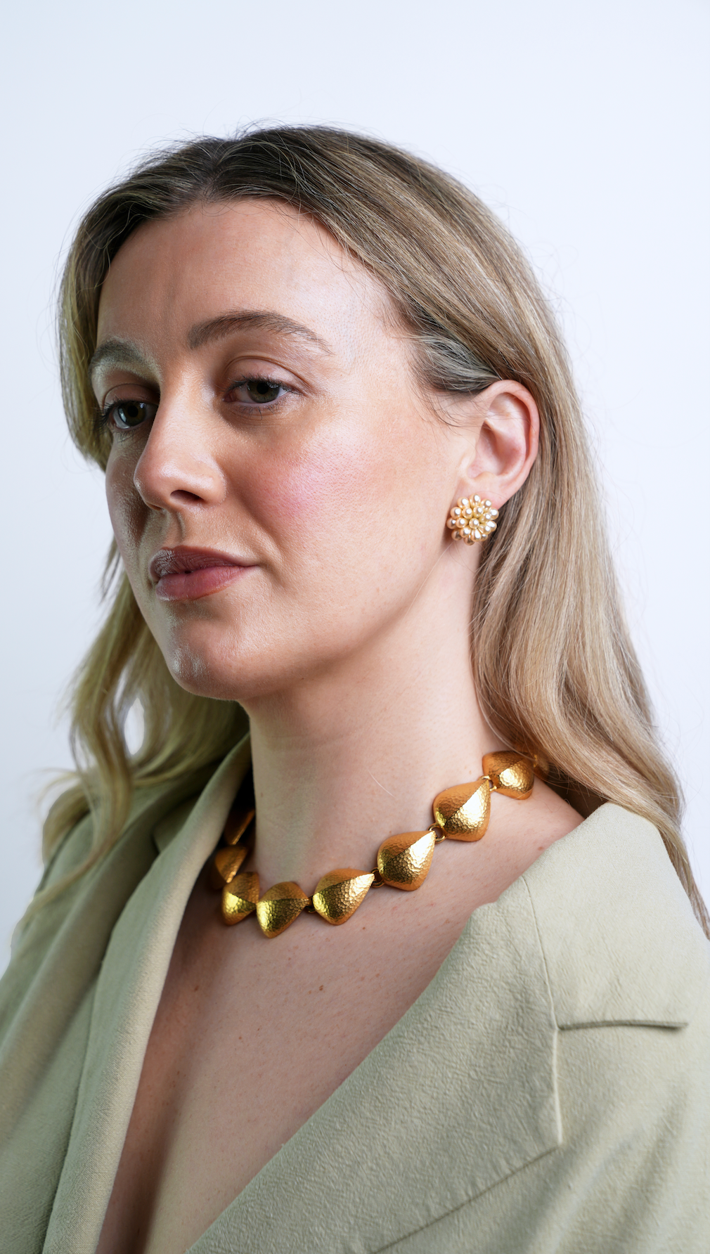 A vintage Givenchy shell necklace from the 1970s, crafted in gold-plated brass with an adjustable length for versatile styling. A signed original with a bold, sculptural design.