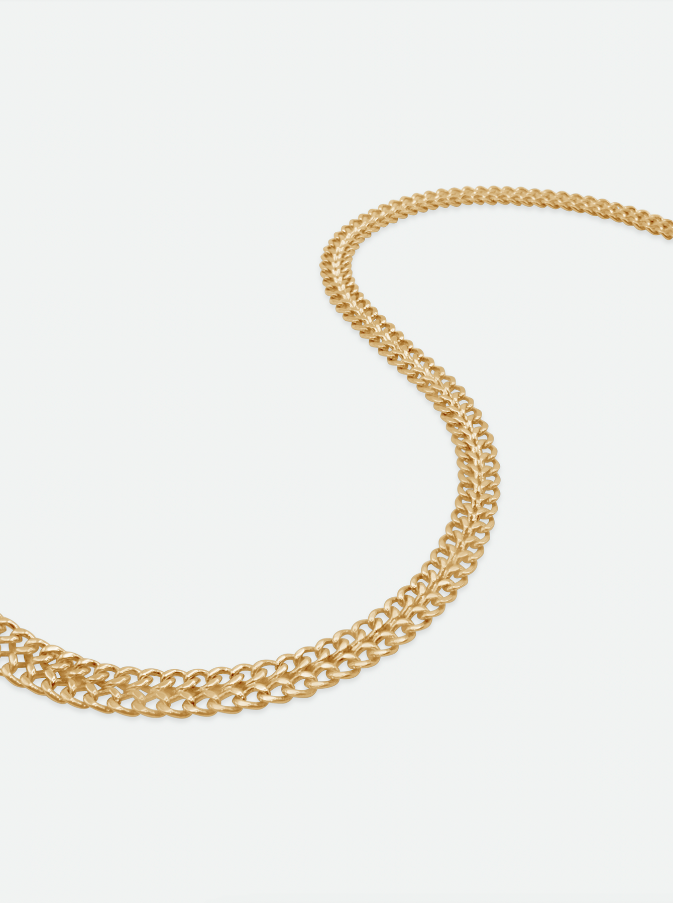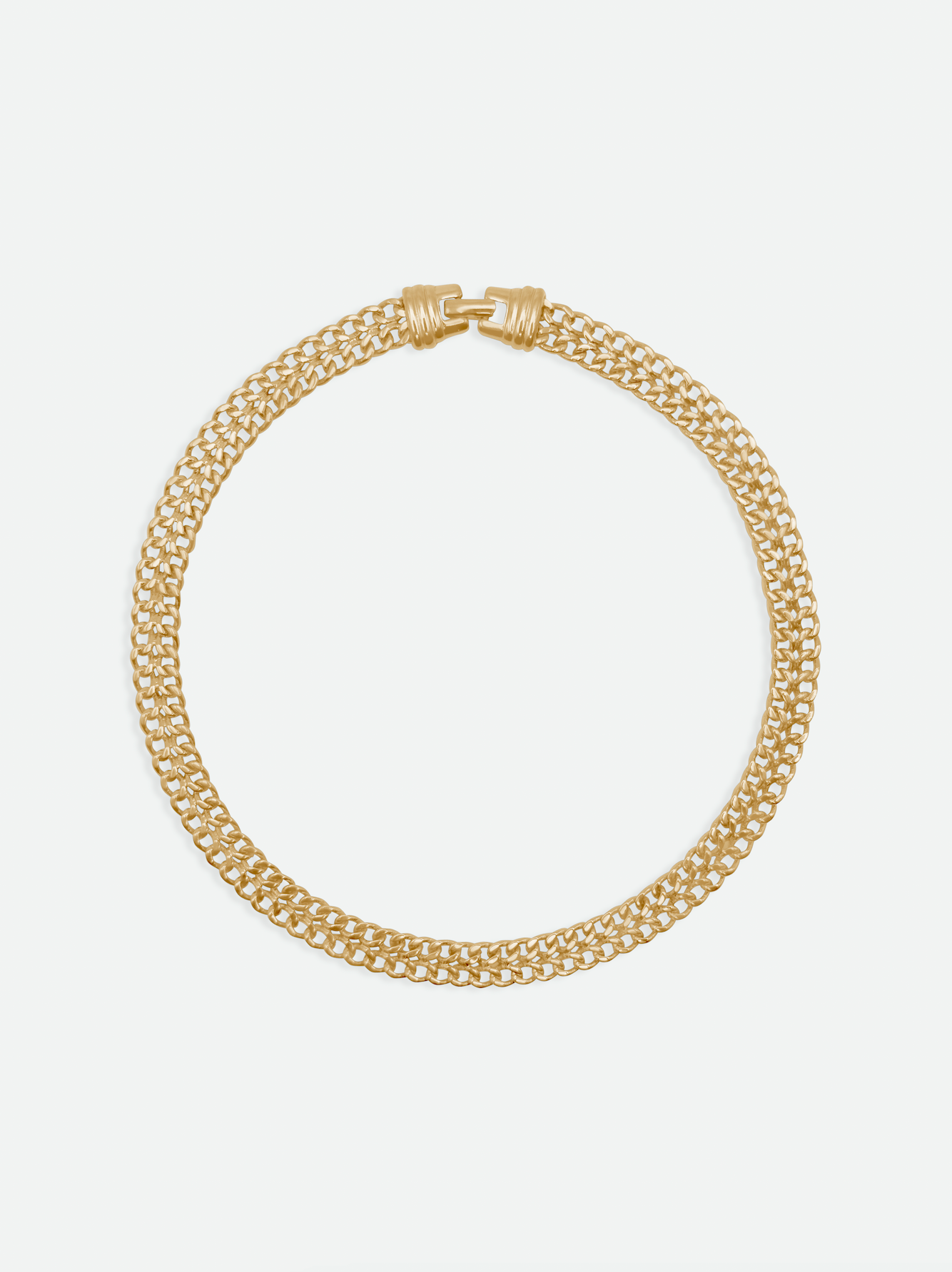 A vintage Monet double link chain necklace from the 1980s, plated in 22ct gold. This signed piece showcases classic craftsmanship, featuring a rollover clasp and a sleek, elegant design.